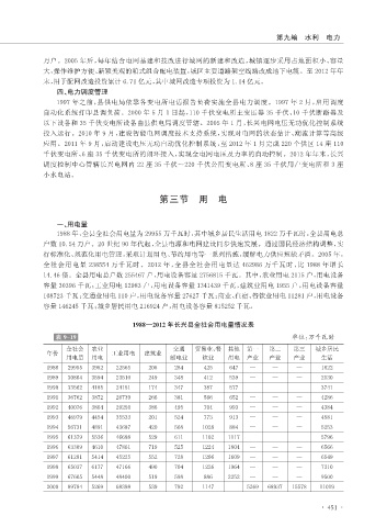 全社会用电量 238554 万千瓦时。2012 年,全县全社会用电量达 462986 万千瓦时,比 1988 年增长