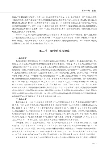 产地检疫 2007 年,实施产地检疫。同年,生猪产地检疫 15.1 万头,检疫率 80%,家禽 1271 万羽