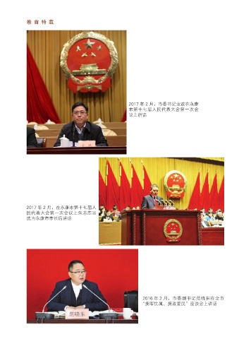 卷 首 特 载 2017 年 2 月,市委书记金政在永康 市第十七届人民代表大会第一次会 议上讲话 2017 年 2 月,在永康市第十七届人 民代表大会第一次会议上朱志杰当 选为永康市市长后讲话 2016 年 2 月,市委副书记范晓东在全市 “拥军优属、拥政爱民”座谈会上讲话