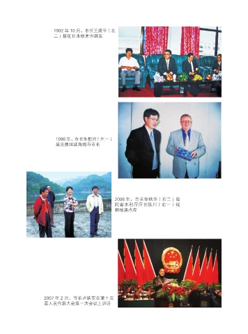 1992 年 10 月,市长王建平(左 二)接见日本枥木市朋友 1996 年,市长朱恒兴(左一) 接见德国波海姆市市长 2006 年,市长李秋华(右二)陪 同省水利厅厅长陈川(右一)视 察杨溪水库 2007 年 2 月,市长卢跃东在第十五 届人民代表大会第一次会议上讲话