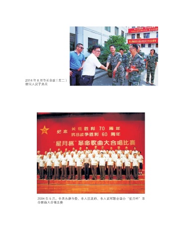 2014 年 8 月市长金政(左二) 慰问人民子弟兵 2004 年 5 月,中共永康市委、市人民政府、市人武部联合举办“星月杯”革 命歌曲大合唱比赛