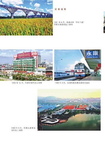 纪 事 留 影 1991 年 6 月,杨溪水库“华东飞渡” 天桥水渠建成投入使用 1992 年 12 月,创建中国科技五金城 1995 年 3 月,金温铁路永康段建成试通车 1999 年 9 月,创建永康市五 金科技工业园