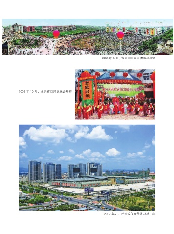 纪 事 留 影 1996 年 9 月 , 首届中国五金博览会盛况 2006 年 10 月,永康市首届农展会开幕 1995 年 3 月,金温铁路永康段建成试通车 2007 年,开始建设永康经济总部中心