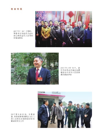 卷 首 特 载 2017 年 1 月 1 日零时, 市委书记金政在方岩山 胡公祠向全市人民鸣钟 祈福迎新年 2017 年 2 月 19 日, 新 任市长朱志杰通过永康 电视台向全市人民发表 惠民施政讲话 2017 年 3 月 22 日, 市 委 常 委、常务副市长胡积合(左三) 深入金胜社区督查居民住宅 楼消防安全工作
