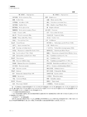 注1. 本表共收录了永康市高等植物177科1538种,其中苔藓植物49科135种;蕨类植物29科107种;种子植物150科