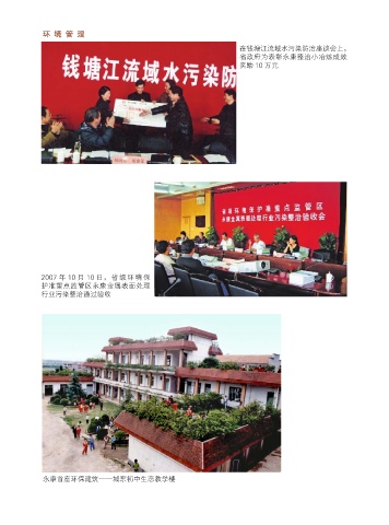 环 境 管 理 在钱塘江流域水污染防治座谈会上, 省政府为表彰永康整治小冶炼成效 奖励 10 万元 2007 年 10 月 10 日,省级环境保 护准重点监管区永康金属表面处理 行业污染整治通过验收 永康首座环保建筑——城东初中生态教学楼
