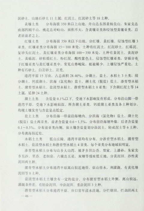 盐 土 土 类 分 布 沿 海 一 带 前 沿 海 塘 内 。 分 滨 海 ( 氯 化 物 ) 盐 土 、 潮土 化