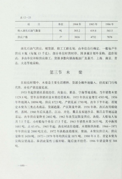 量 降 至 1 4 3 0 吨 。 1 9 7 3 ~ 1 9 79 年 年 均 供应 量 1 0 7 1 吨 。 1 9 80 年 8 月 , 省定 木 柴为